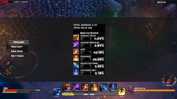 Игра предлагает создавать мощные билды, дающие почти божественные способности в бою с сотнями противников одновременно. Между забегами доступна мета-прогрессия с деревьями навыков персонажей и системой достижений.