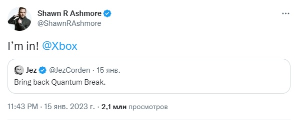 Шон Эшмор, известный по роли мутанта Айсмена из кинофраншизы “Люди Икс”, не прочь сыграть в сиквеле Quantum Break. Об этом он сообщил в твиттере, ответив на пост, в котором Remedy просили вернуться к этой IP: