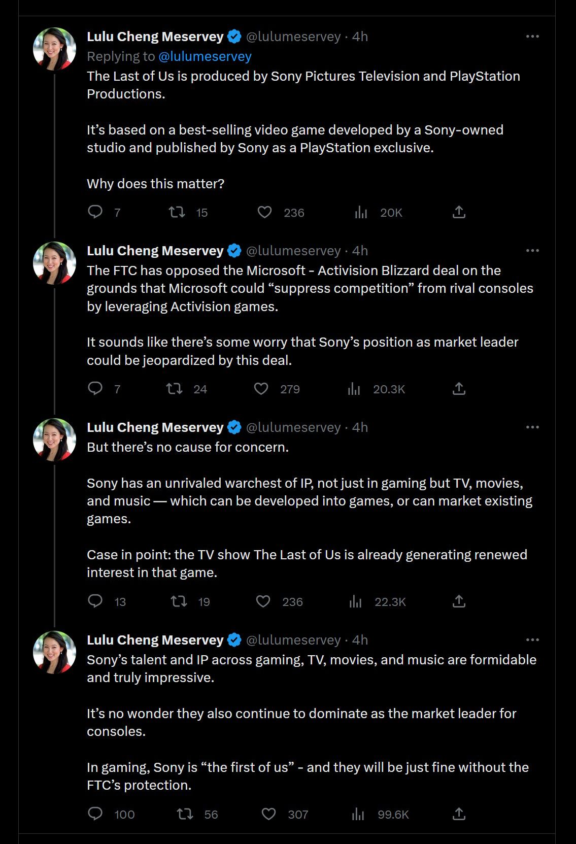После этого Лулу объяснила, что FTC выступает против сделки Activision Blizzard и Microsoft из-за опасения подавления конкуренции, особенно в отношении таких франшиз как Call of Duty, которые могут стать эксклюзивами Xbox. Мезерви подчеркнула, что успех The Last of Us демонстрирует, что беспокоиться не о чем, ведь у Sony накопился целый ящик франшиз, и не только игровых, но на ТВ, в кино и музыке, которые могут быть перенесены в игры, или использоваться для маркетинга существующих игр.