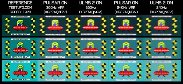 Сравнение с лучшими альтернативами подтвердило лидерство Pulsar. Технология превосходит ULMB 2 на Asus PG27AQN и DyAc 2 на BenQ XL2586X, хотя ULMB 2 на 540 Гц Asus PG248QP остаётся конкурентоспособной по чистой чёткости. Pulsar также чётче WOLED-панелей на 540 Гц: с 4-кратным улучшением чёткости эффективная частота обновления составляет 1440 Гц против эквивалента 810 Гц у OLED.