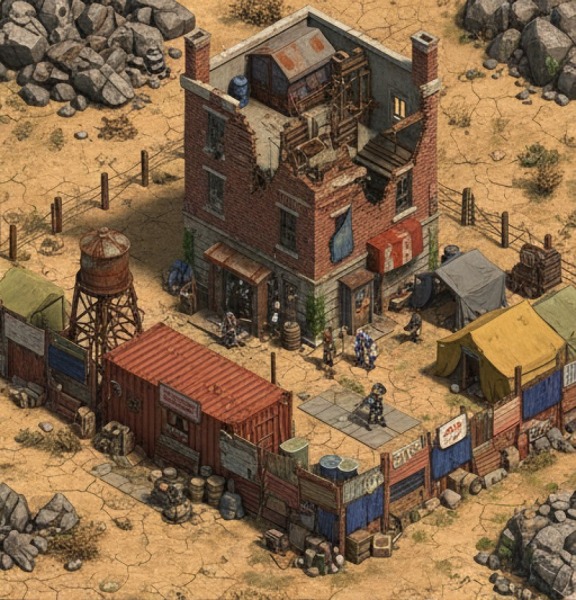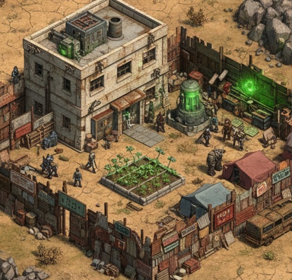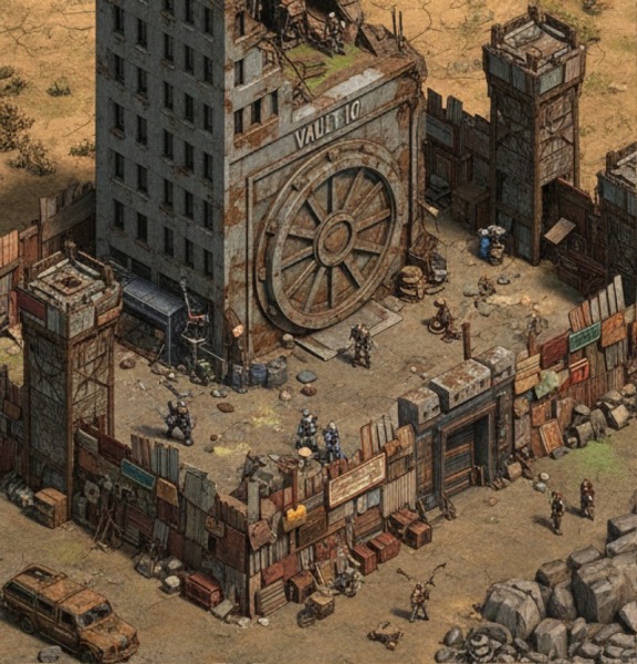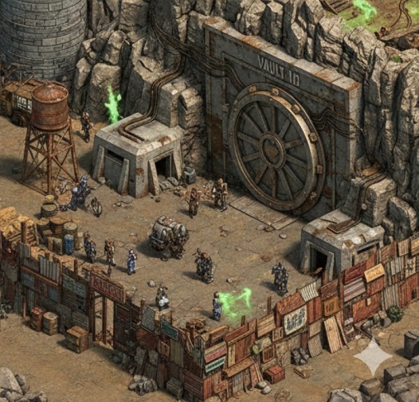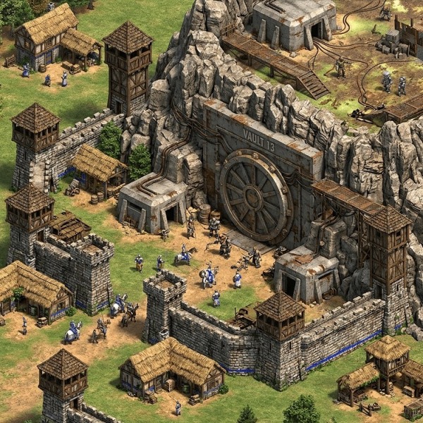Концепт показывает укрепления в узнаваемом изометрическом стиле Age of Empires 2, но с некоторыми постапокалиптическими элементами Fallout – бункеры, дверь Убежища и персонажей, похожих на супермутантов. В остальном, логика довольно сломанная – тут можно увидеть каменные стены и сторожевые башни, конницу и классические строения из Age of Empires.