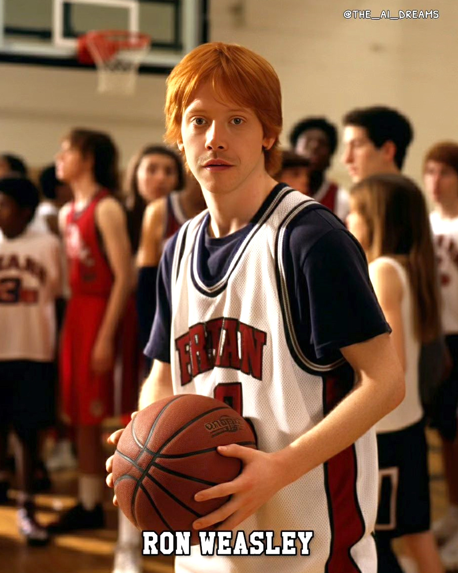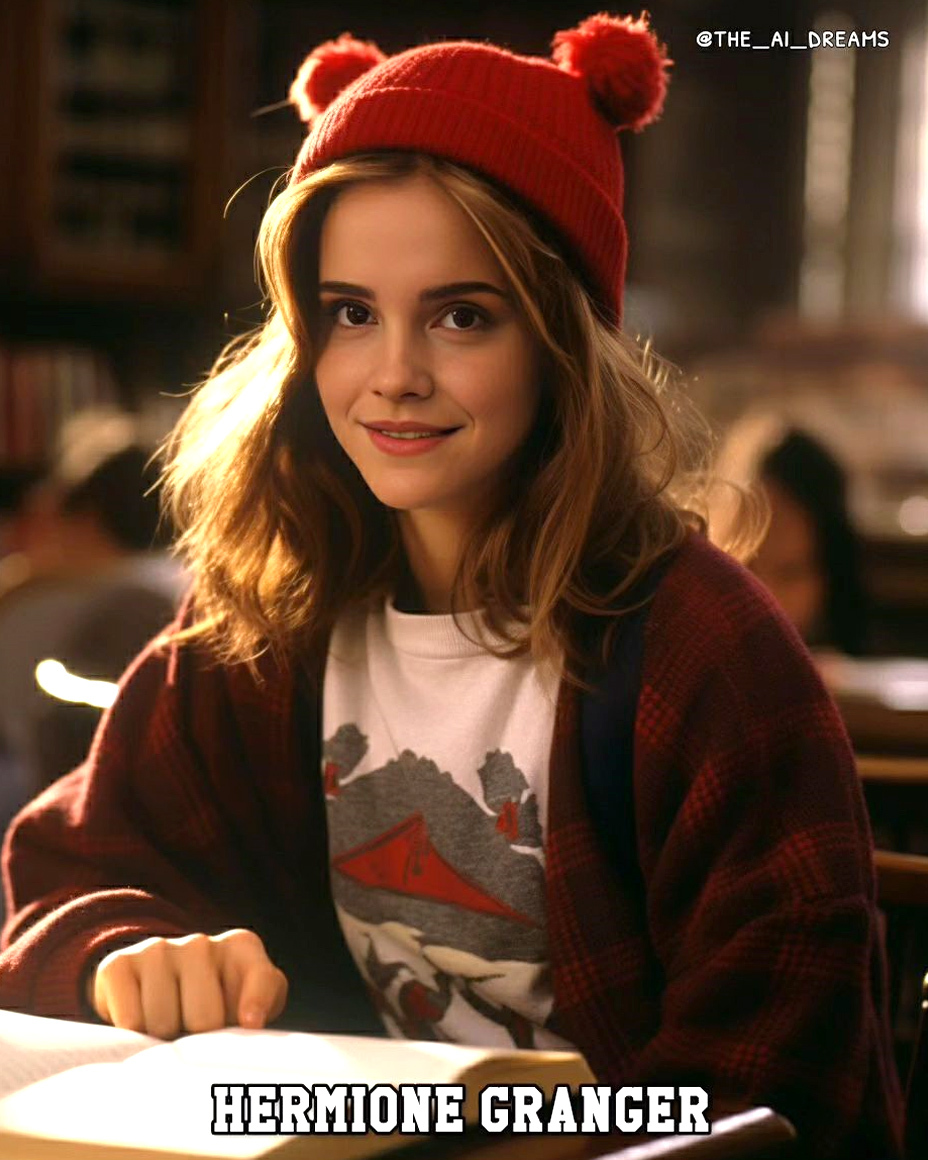 Знаменитую кинофраншизу «Гарри Поттер» представили в совершенно нетипичном для нее виде. Главных героев «Гарри Поттера», среди которых и Гермиона Грейнджер, показали в виде обычных школьников, не обладающих магией. Сам Хогвартс также оказался самой простой школой, а не школой волшебства. Рон Уизли в исполнении Руперта Гринта (Rupert Grint) предстал в виде школьного баскетболиста, а сам Гарри Поттер, роль которого сыграл Дэниел Рэдклифф (Daniel Radcliffe), оказался самым обычным учеником без намека на избранность. Гермиона Грейнджер в исполнении Эммы Уотсон также предстала в образе простой ученицы.