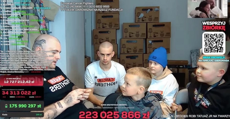 Фото: ФБ Польське радіо для України В апреле Польша пережила событие, которое многие уже называют историческим для всей цифровой эпохи страны. Молодой стример Патрик Гарковски, известный под псевдонимом Łatwogang, запустил благотворительный прямой эфир на YouTube в поддержку детей, страдающих от онкологии. Через несколько дней стало понятно, что в Польше произошла крупнейшая благотворительная онлайн-кампания в истории – об этом в материале Коротко про. До этого Łatwogang был известен прежде всего молодежи. Он работал в привычной для него манере: создавал короткие видео и юмористический контент, то есть был прямым представителем поколения TikTok, YouTube и стриминговых платформ. Как рассказал сам блогер, отправной точкой стала песня Ciągle tutaj jestem (diss na raka), записанная рэпером Bedoes 2115 вместе с 11-летней Майей Мецан, которая проходила лечение от лейкемии и находилась под опекой фонда Cancer Fighters («Борцы с раком»). История ребенка растрогала польскую аудиторию, а сама песня быстро разошлась по соцсетям. На фоне своего собственного сострадания и успешного трека Łatwogang предложил простой и почти абсурдный по форме челлендж: чем больше лайков наберет стрим из комнаты блогера, тем дольше он будет слушать эту песню в прямом эфире. Полякам идея понравилась, она была легкой, понятной и идеально подходила для вирусного распространения. Люди начали ставить лайки, делиться видео и подталкивать друзей участвовать. Łatwogang вел стрим не из телестудии с декорациями, а из маленькой квартиры. На экране зрители видели уставшего человека, донат-счетчик, приходящих гостей, шум, импровизацию и эмоции. Трансляция сочетала сбор средств с вирусным развлечением. В один момент в прямом эфире было публично урегулировано давнее противостояние двух известных польских рэперов. В другой раз на заднем плане тренировался польский боксер-тяжеловес Артур Шпилька, пока росло количество пожертвований. Также в квартиру пытался забраться неизвестный мужчина. Все эти моменты перемежались с более спокойными сценами – визитами детей, борющихся с раком, которые общались со стримерами и отвечали на вопросы зрителей в YouTube. За 9 суток эфира ведущий не спал, терял голос, смеялся, удивлялся очередным пожертвованиям или просто сидел в тишине. Многие зрители признавались в комментариях, что заходили «на пять минут посмотреть», а оставались на часы. На стрим к Łatwogang приходили музыканты, спортсмены, блогеры, актеры, телеведущие. Не было только политиков – это было жестким условием трансляции. В студии побывали футболист Роберт Левандовски, который передал памятные предметы для аукционов и выразил поддержку детям фонда (передал 1 млн злотых), певица Дода, сам репер Bedoes 2115 (пожертвовал 1 млн злотых), с песни которого все началось. Также было несколько примечательных фигур польского интернета – Friz, Wersow, Kuba Patecki и другие. Каждый гость приводил за собой собственную армию зрителей. Фронтмен британской группы Coldplay Крис Мартин принял участие в виде заранее записанного видео, исполнив отрывок на польском языке под аккомпанемент фортепиано. Побывали в гостях у стримера вратарь сборной Польши Войцех Щенсны и испанский футболист Ламин Ямаль. Польская теннисистка Ига Свентек пожертвовала 100 тыс. злотых и выставила на аукцион билеты на Уимблдон. Корпоративные доноры – в основном, польские компании, жертвовали о