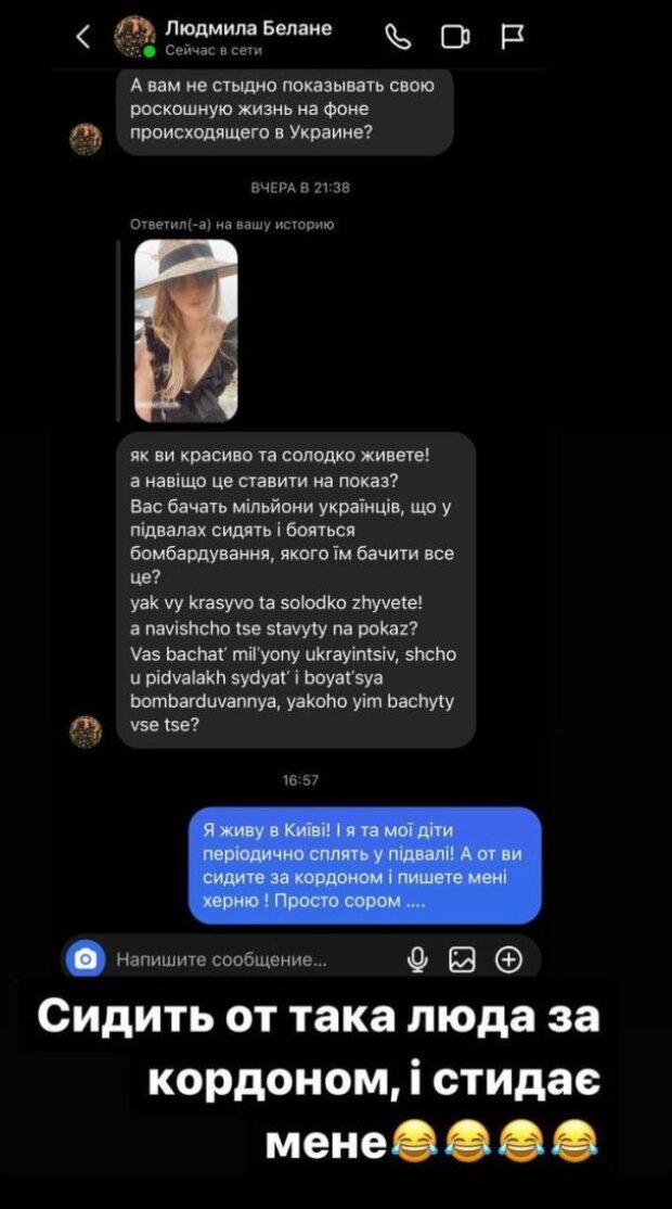 Певица молчать не стала. Она опубликовала скриншот сообщения некой Люды, и ответила ей. Звезда написала, что во время войны живет в Киеве. Когда русские оккупанты обстреливают Украину, она так же, как и все украинцы прячется от вражеских ракет.