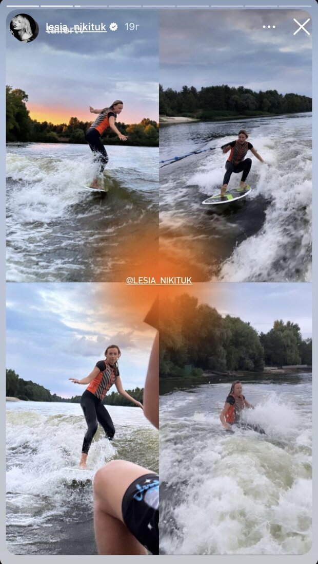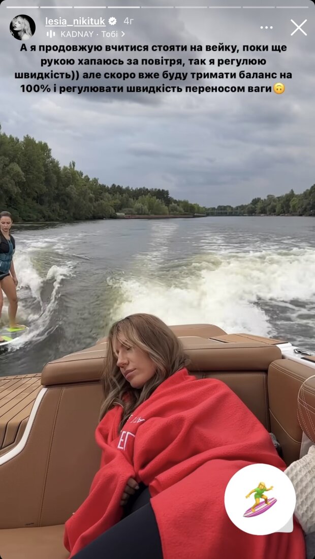 Также Никитюк продемонстрировала поклонникам, что уже умеет уверенно стоять на вейкборде, не держась руками за специальный поручень, который крепится к лодке.