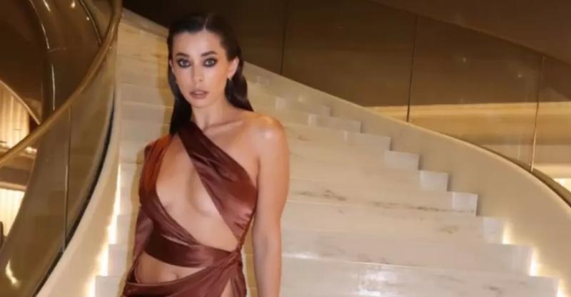 Девушка позировала на красной дорожке в коричневом асимметричном платье с драпировкой и вырезами Фото: instagram.com/neplyah