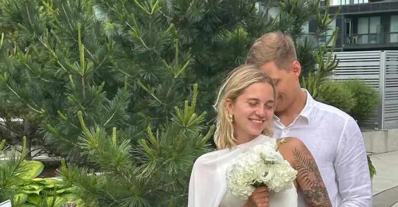 Для церемонии бракосочетания девушка выбрала белое платье с накидкой, а жених – льняную белую рубаху и серые брюки. Сама Наталья также выложила в соцсети пост, где появляется в кадре с белым букетом цветов.