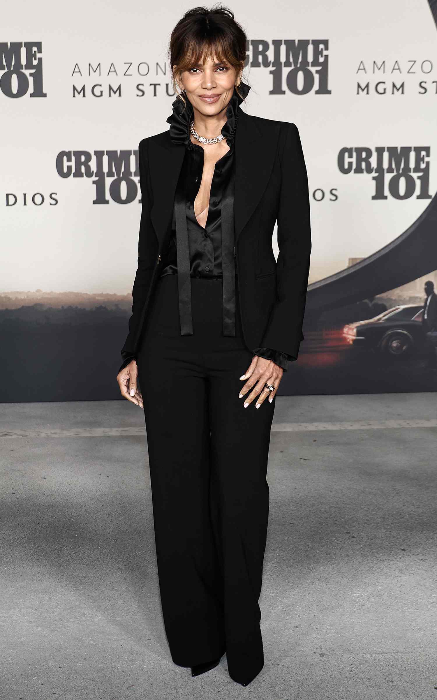 На своей последней премьере Берри дополнила свой новый бенгальский огонь золотым колье и шикарным черным костюмом в сочетании с шелковой блузкой с воротником с рюшами и глубоким вырезом.