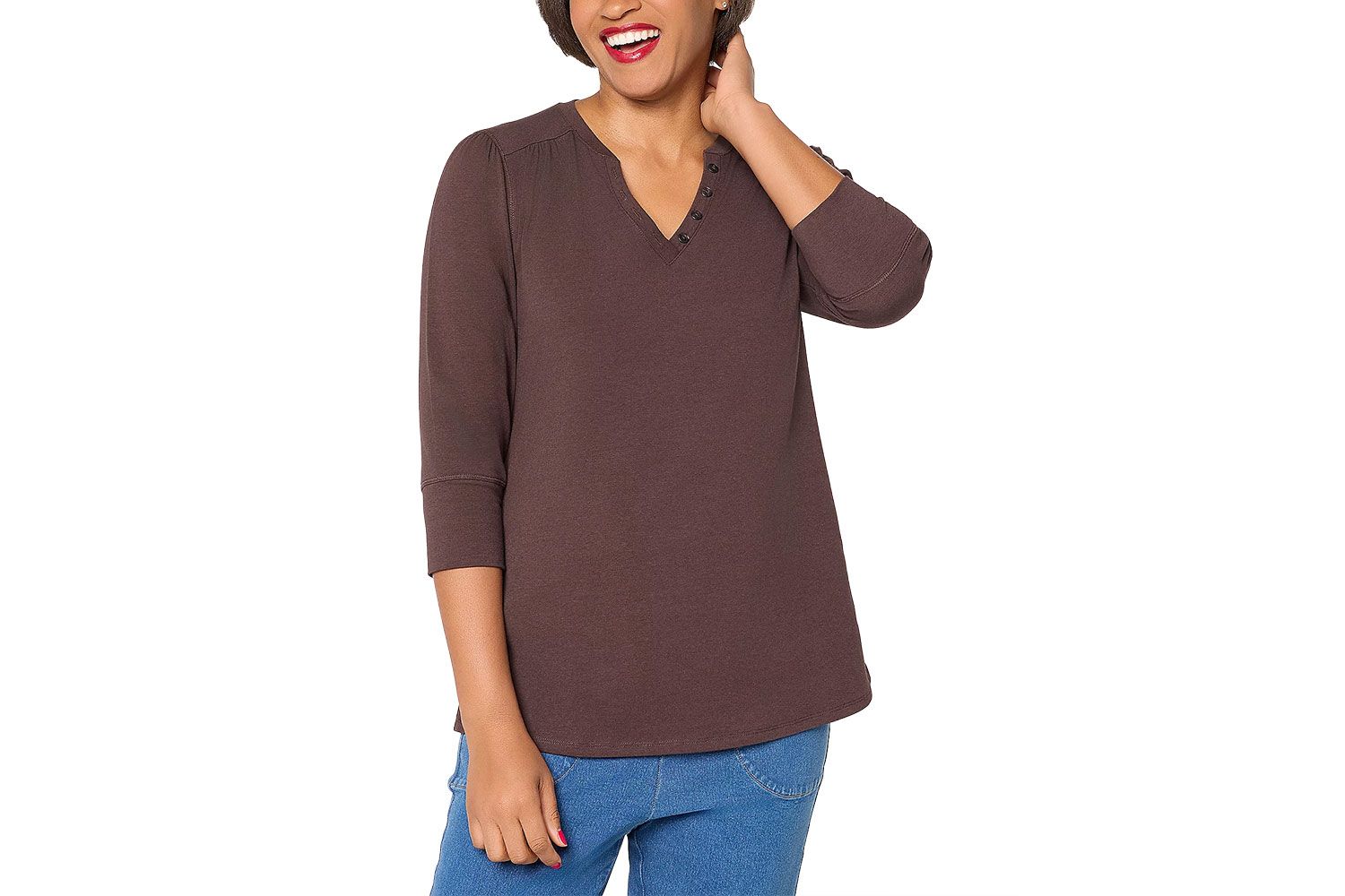 Наденьте этот верх под кардиганы, жилетки и легкие куртки, пока зима еще здесь, а затем, когда погода станет теплой, используйте его отдельно. Трикотаж легкий и мягкий, силуэт свободный благодаря скромному V-образному вырезу с акцентом на пуговицах. Он доступен в четырех размерах, включая традиционные нейтральные цвета, такие как кремовый, черный и коричневый, а также оливковый оттенок для некоторых цветов.