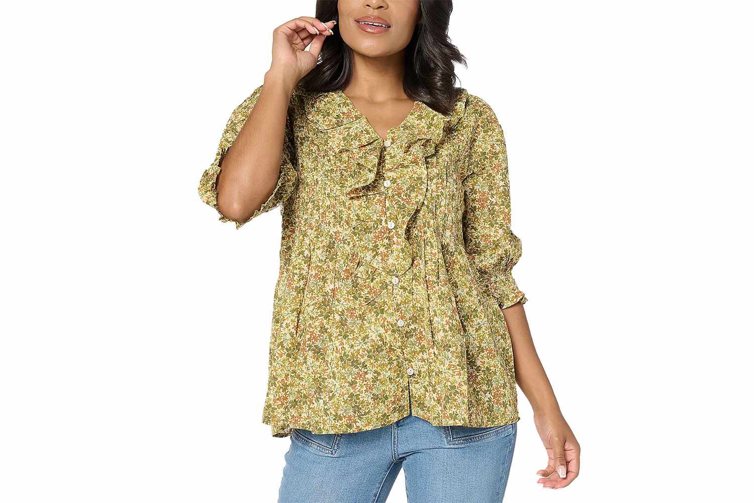 - Блуза с оборками спереди из 100% хлопка с принтом, 55 долларов США (оригинал 87 долларов США)