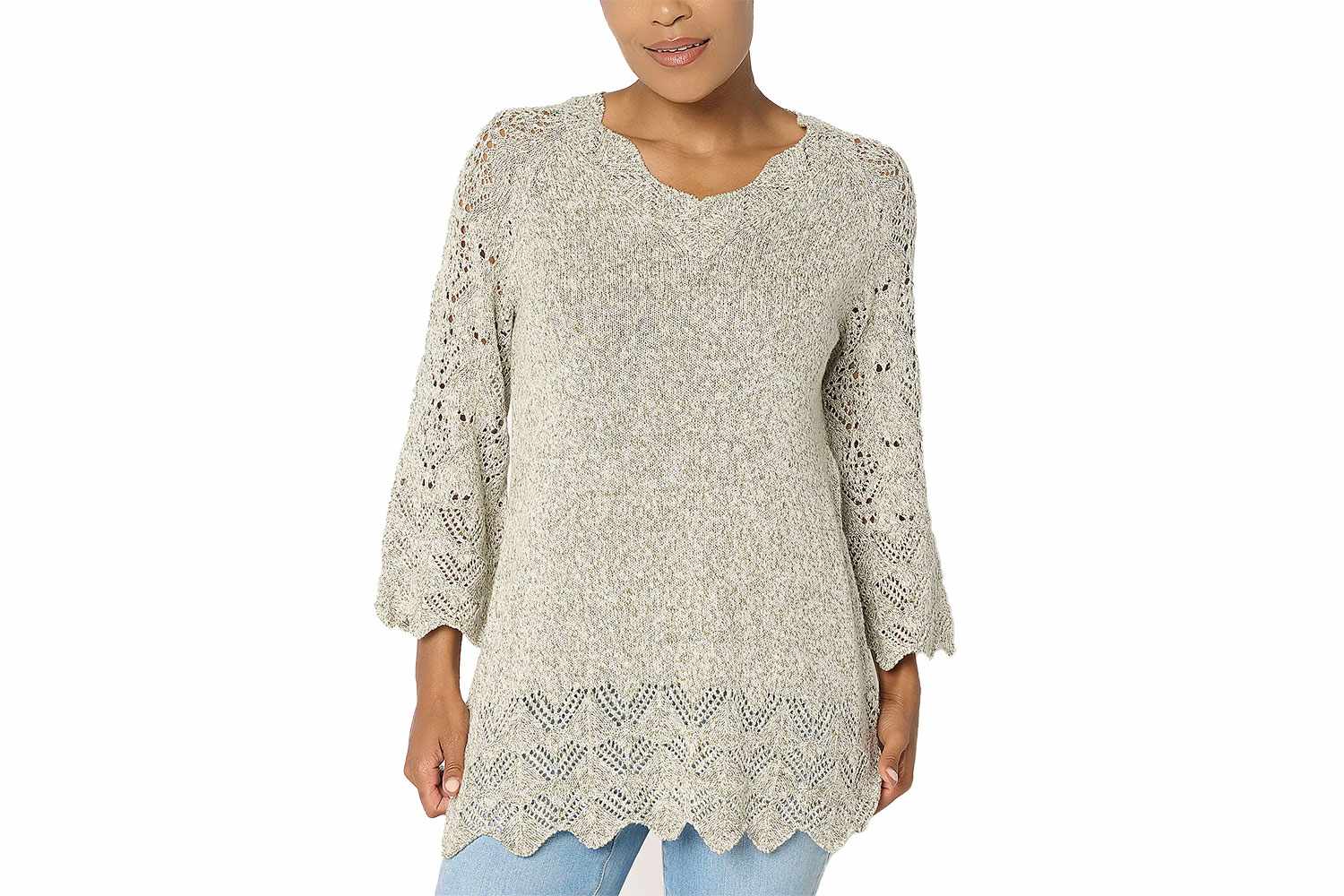 Этот универсальный свитер с очаровательными деталями можно носить с джинсами или юбками. У него зубчатый край по краю, кружевной дизайн в виде пуантов и изящные рукава-колокольчики. Полуприлегающий вид не обтягивает и не сковывает движений, он достаточно легкий, чтобы его можно было носить весной.