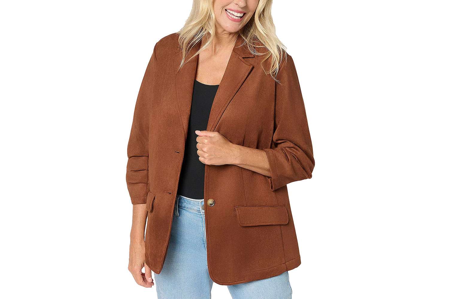 - Классика с изюминкой: Замшевый пиджак с присборенными рукавами, 120 долларов США (оригинал 132 доллара США)