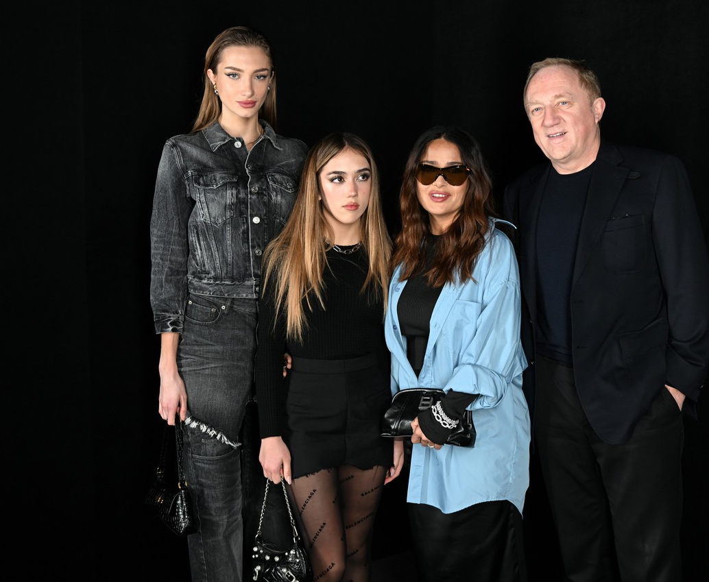 Сальма Хаейек стала сенсацией прошедшего шоу Balenciaga в Париже. Мало того, что актриса появилась в необычном образе: рубашке, надетой поверх лонгслива (мы взяли этот микротренд на заметку), она еще продемонстрировала роскошные бриллиантовые браслеты, тоже надетые поверх длинных рукавов (еще один микротренд). Вдобавок ко всему, звезда фильма «От заката до рассвета» показала своих прекрасных дочек, которых крайне редко выводит в свет. Сальма Хайек и Франсуа-Анри Пино посетили показ с их общей дочерью Валентиной, 14 лет, и дочерью Анри от первого брака Матильдой, которой исполнился 21 год.