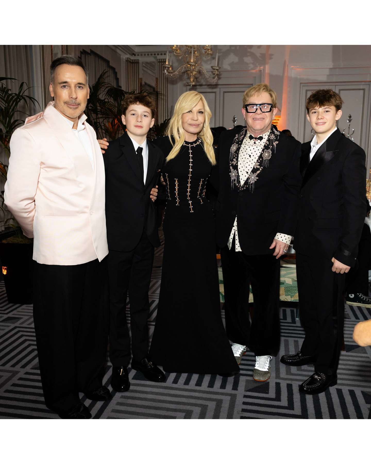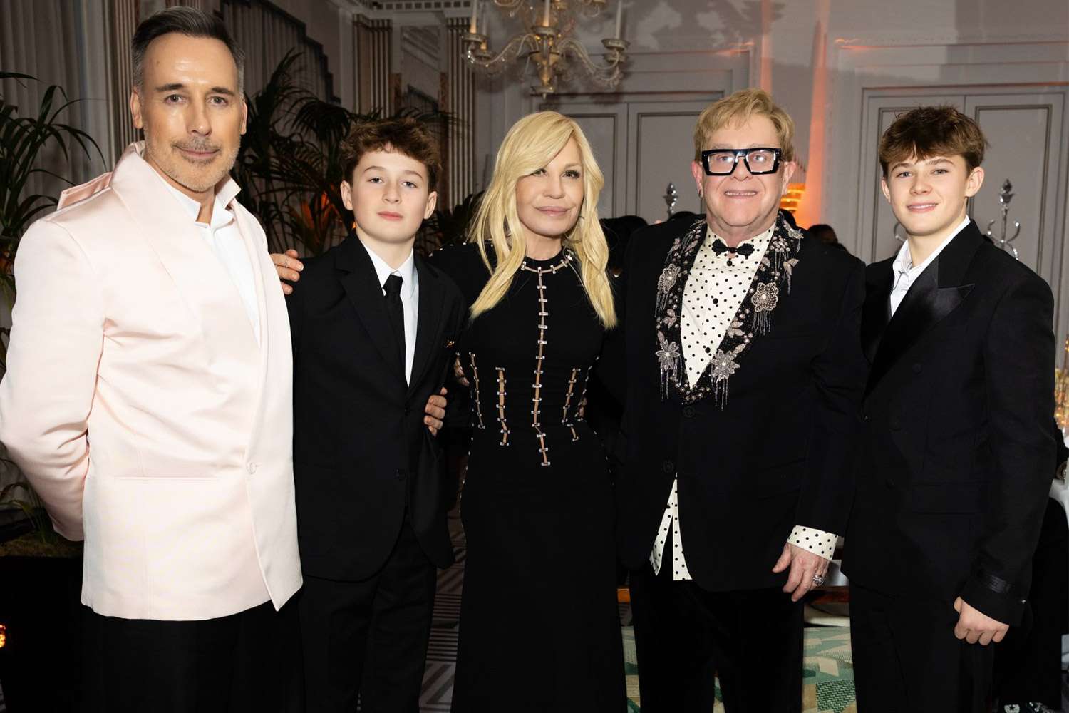 Дэвид Ферниш и Элтон Джон позируют с Донателлой Версаче (в центре) и их сыновьями Закари, 14 лет, и Элайджей, 12 лет.