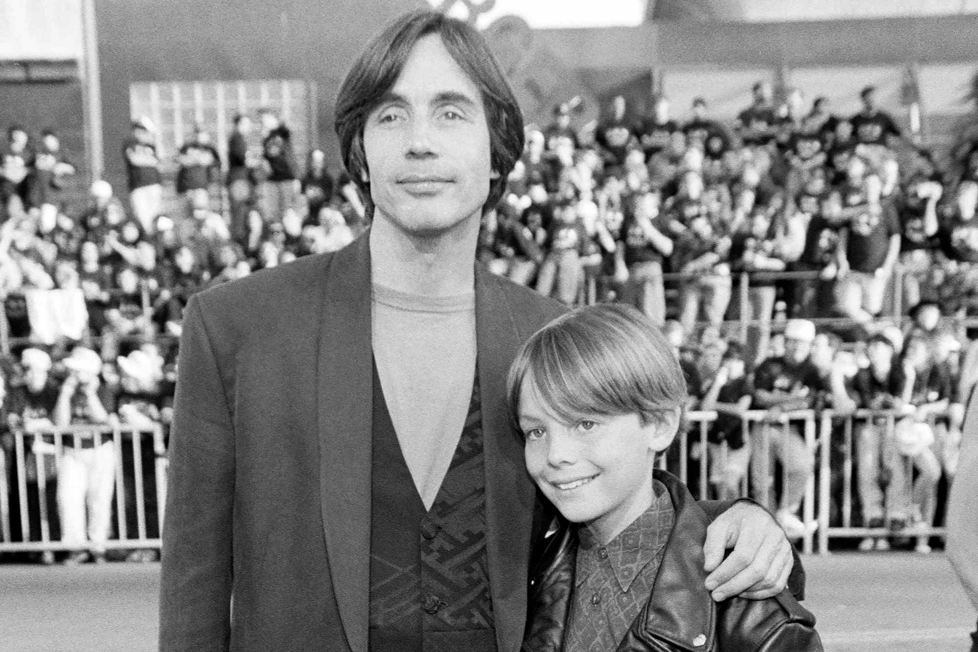 Джексон Браун и сын Итан Браун на премьере фильма “Бэтмен возвращается” в Лос-Анджелесе, июнь 1992 года.