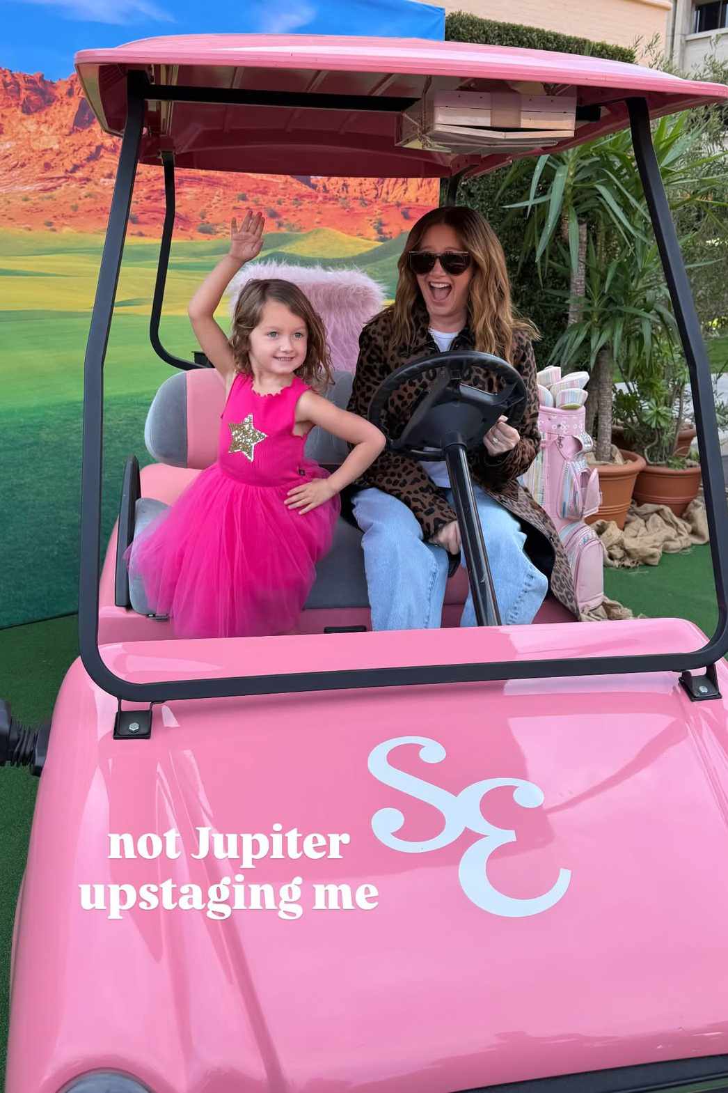 Ее дочь, Юпитер Айрис Френч, 4 года, сопровождала маму на праздник. Юпитер был одет в ярко-розовое платье с золотой звездой и соответствующими золотыми аксессуарами. Малыш позировал для фото с Тисдейл Френч в знаменитой розовой тележке для гольфа Шарпей из High School Musical 2 . «Не Юпитер меня отодвигает на второй план», — подписала пост Тисдейл Френч.