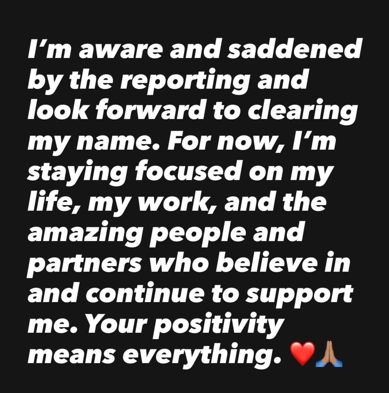 «На данный момент я остаюсь сосредоточенным на своей жизни, своей работе и замечательных людях и партнерах, которые верят в меня и продолжают поддерживать меня», — говорит он. заявление продолжилось. «Ваш позитив означает все. ❤️🙏🏾."