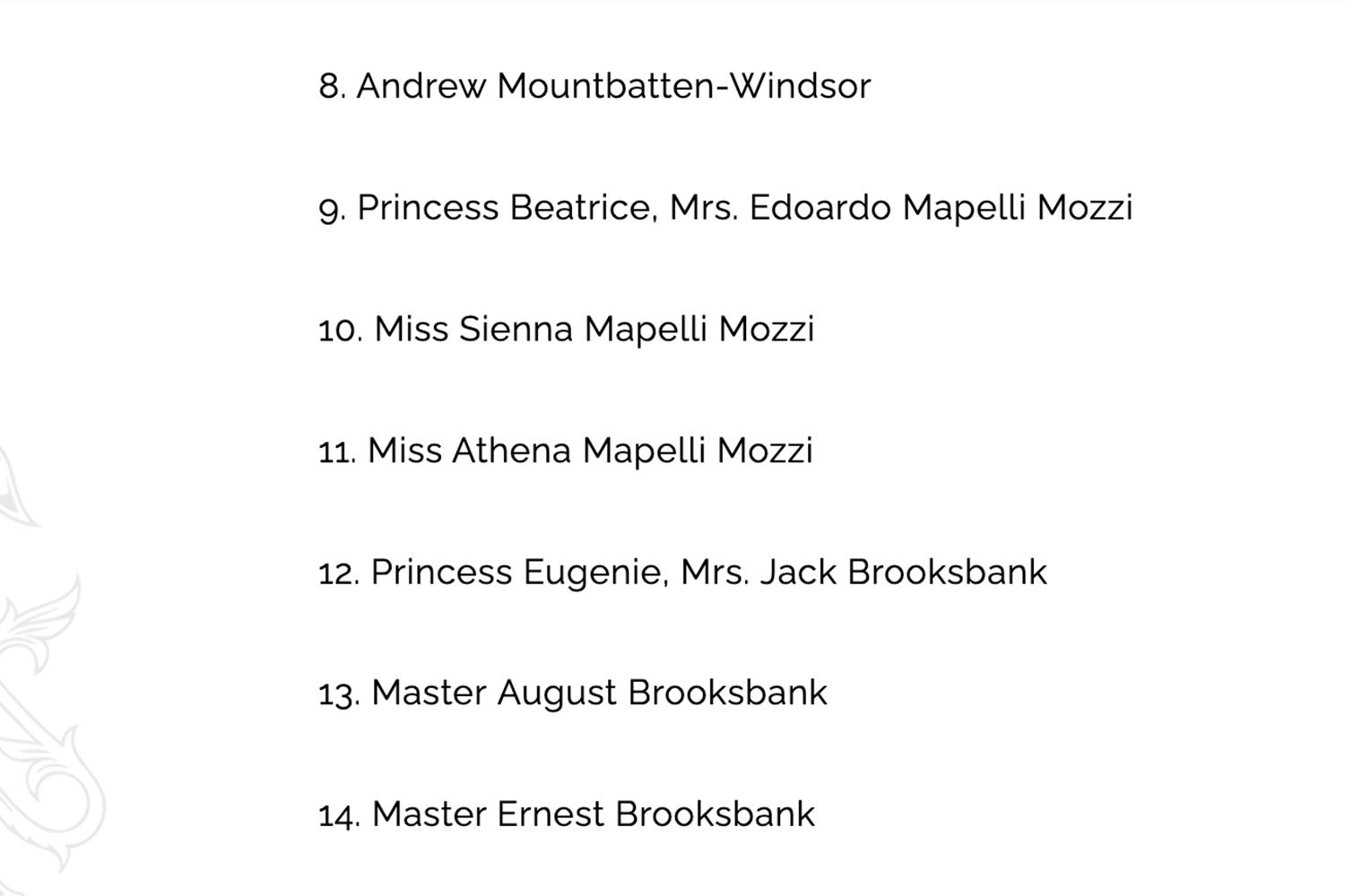 Беатрис указана как «Принцесса Беатрис, миссис Эдоардо Мапелли Моцци», что отражает ее брак с Эдоардо Мапелли Моцци, а Евгения также названа «принцессой Евгенией, миссис Джек Бруксбанк», что отражает ее союз с Джеком Бруксбанком.