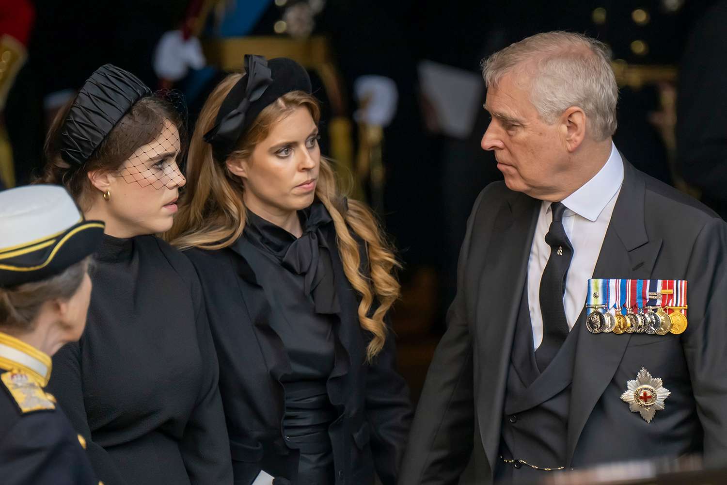 Принцесса Евгения, принцесса Беатрис и принц Эндрю во время процессии гроба королевы Елизаветы в Лондоне, 14 сентября 2022 года.