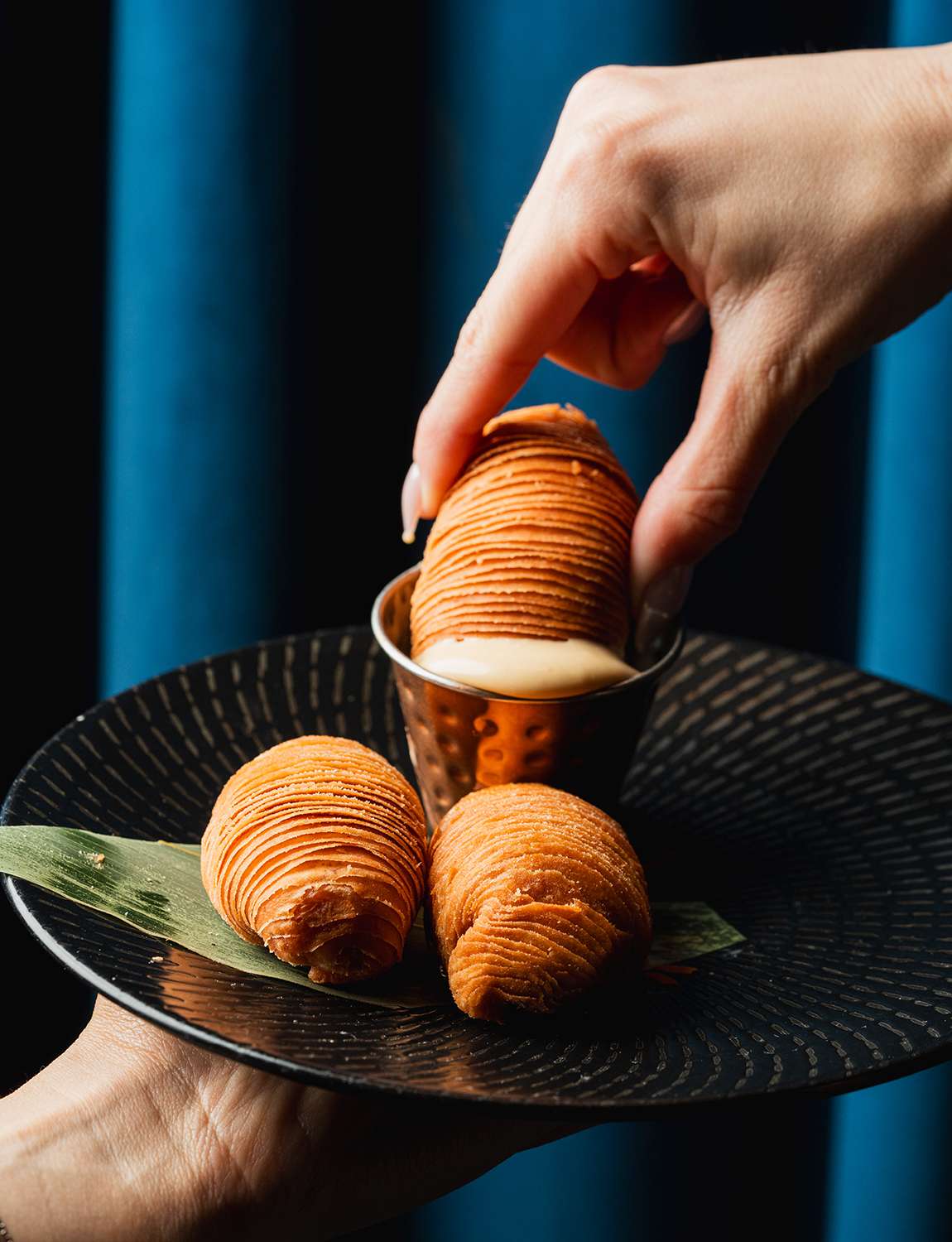 Японскую говядину вагю нарезают ломтиками, заворачивают в слоеное тесто и подают с айоли мисо понзу.