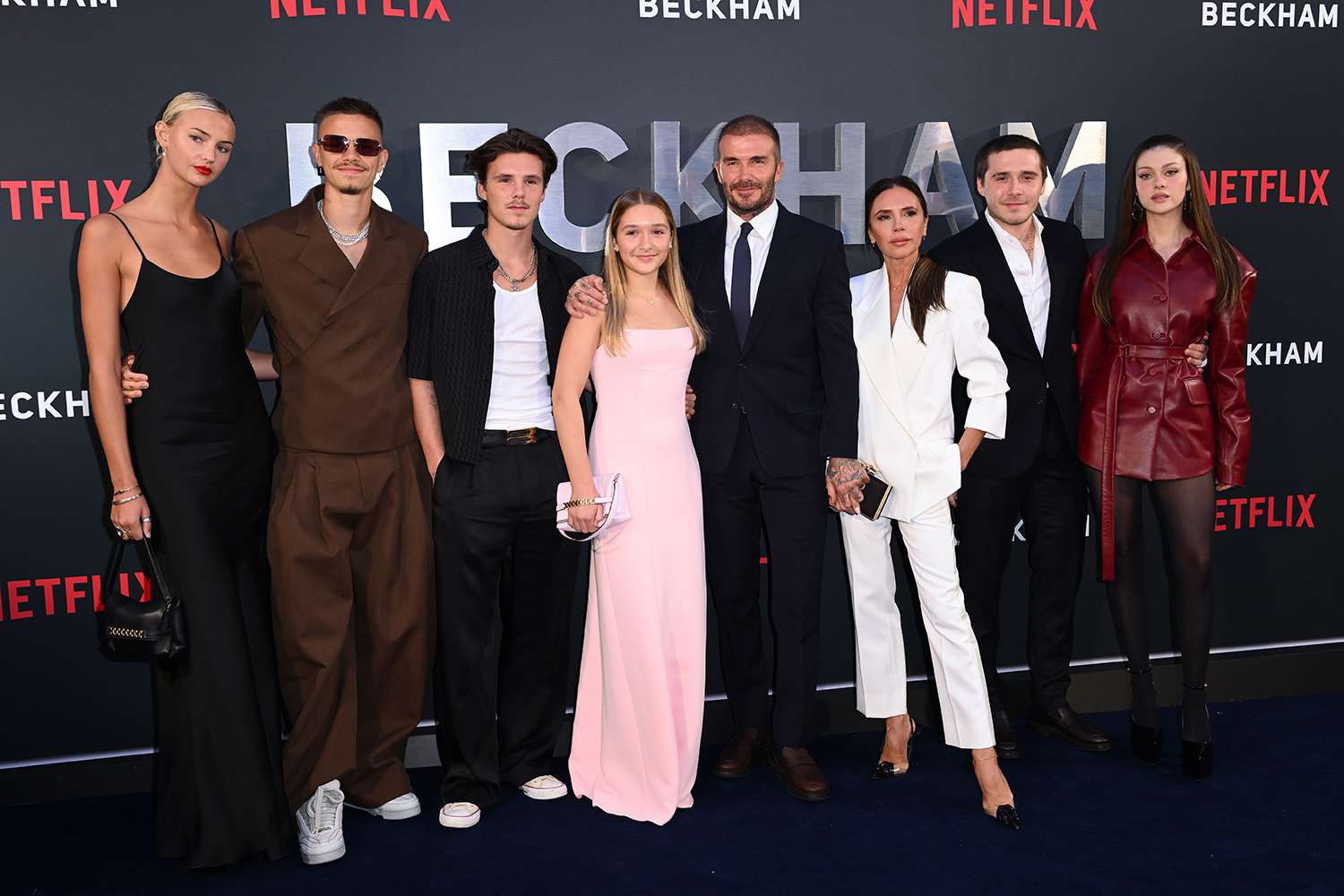 Миа Риган, Ромео Бекхэм, Круз Бекхэм, Харпер Бекхэм, Дэвид Бекхэм, Виктория Бекхэм, Бруклин Бекхэм и Никола Пельц на фото в октябре 2023 года.